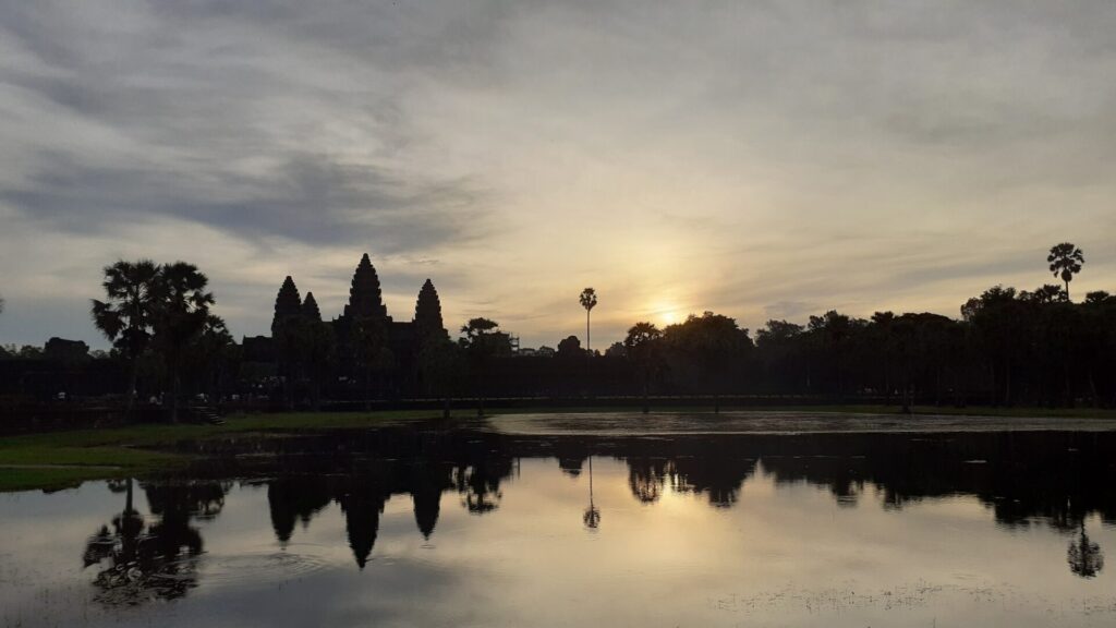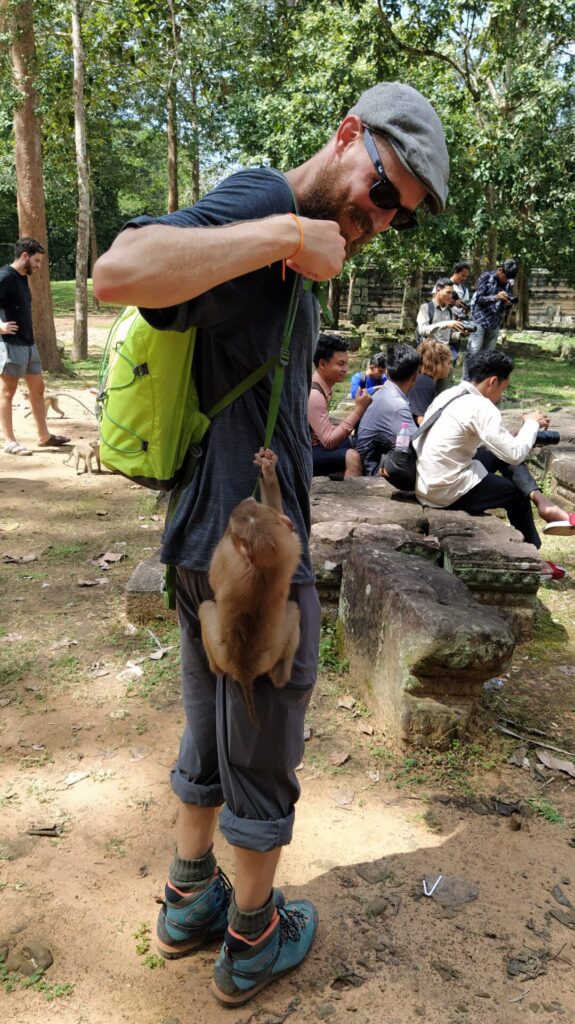 Nach zwei Tagen Tempel machen wir einen Tag Pause in der Stadt, bevor wir den dritten Tempel-Tag mit dem Sonnenaufgang bei Angkor Wat starten. So wenige Touristen wie man sonst sieht, der Sonnenaufgang ist offensichtlich beliebt. Im Anschluss lichten sich die Reihen wieder. Wir besichtigen Angkor Wat von innen und danach die Tempel um Angkor Thom, bei denen sich auch einige Affen tummeln. Einer der Affen will Alex näher kennen lernen und hüpft zielstrebig zu ihm und klettert an seinem Rucksack nach oben.